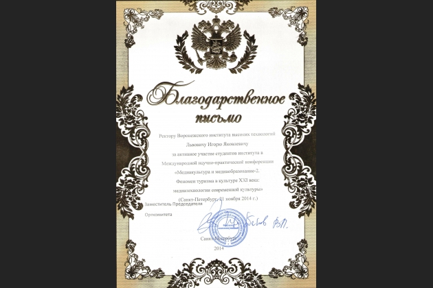 C 21 по 22 ноября 2014 года в Санкт-Петербургском государственном университете кино и телевидения в рамках Дней философии проводилась международная научно-практическая конференция «Медиакультура и медиаобразование II (Феномен туризма в культуре XXI века: медиатехнологии современной культуры)».