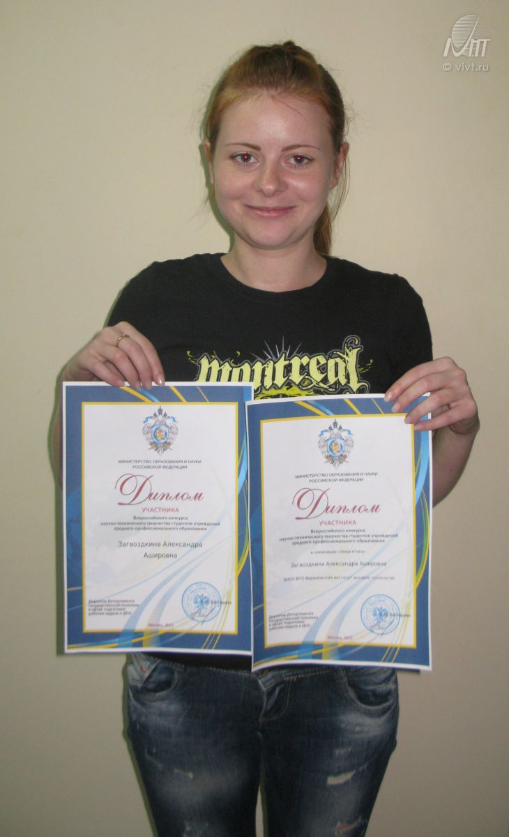 В июле-августе 2015 г. проводился Всероссийский конкурс работ научно-технического творчества студентов учреждений среднего профессионального образования.По итогам данного мероприятия студентка Воронежского института высоких технологий Александра Загвоздкина была награждена дипломами в двух номинациях.